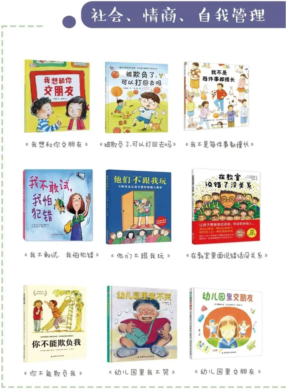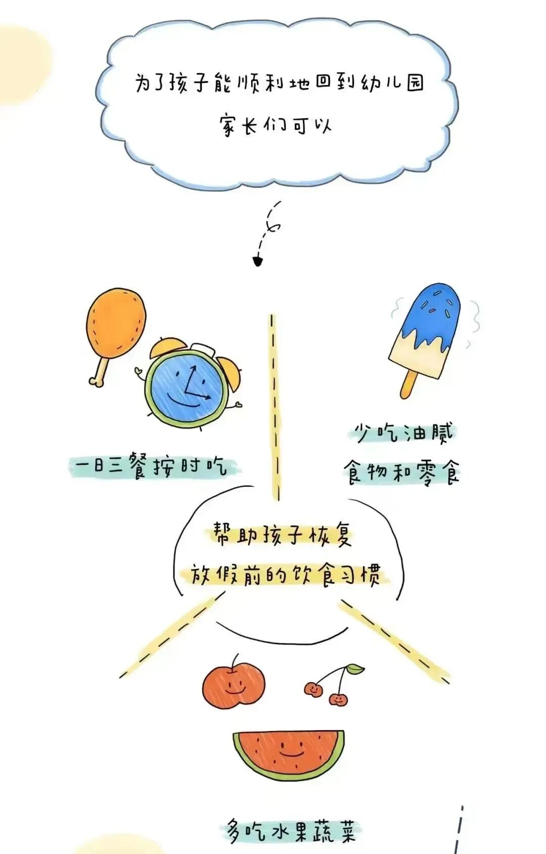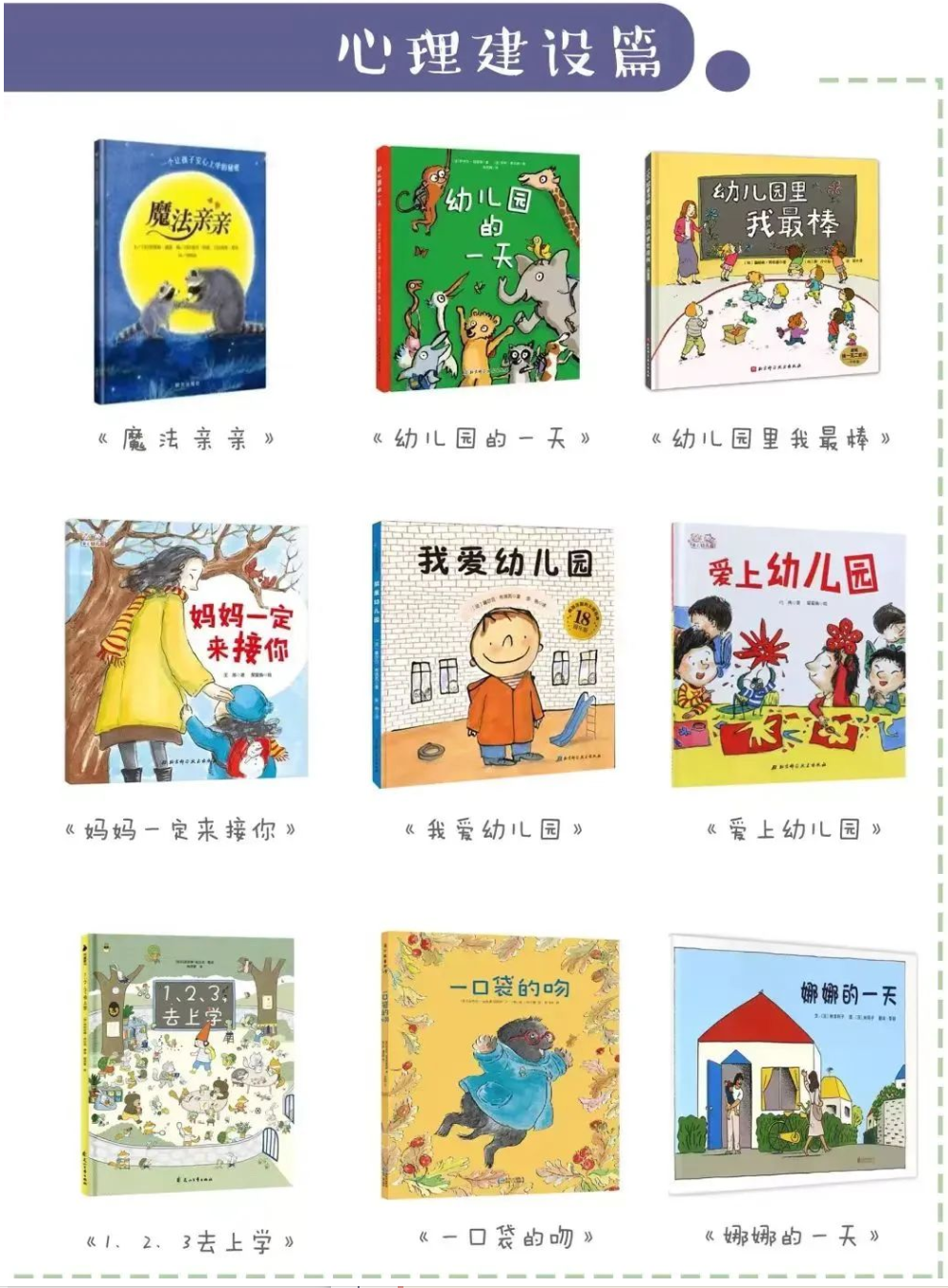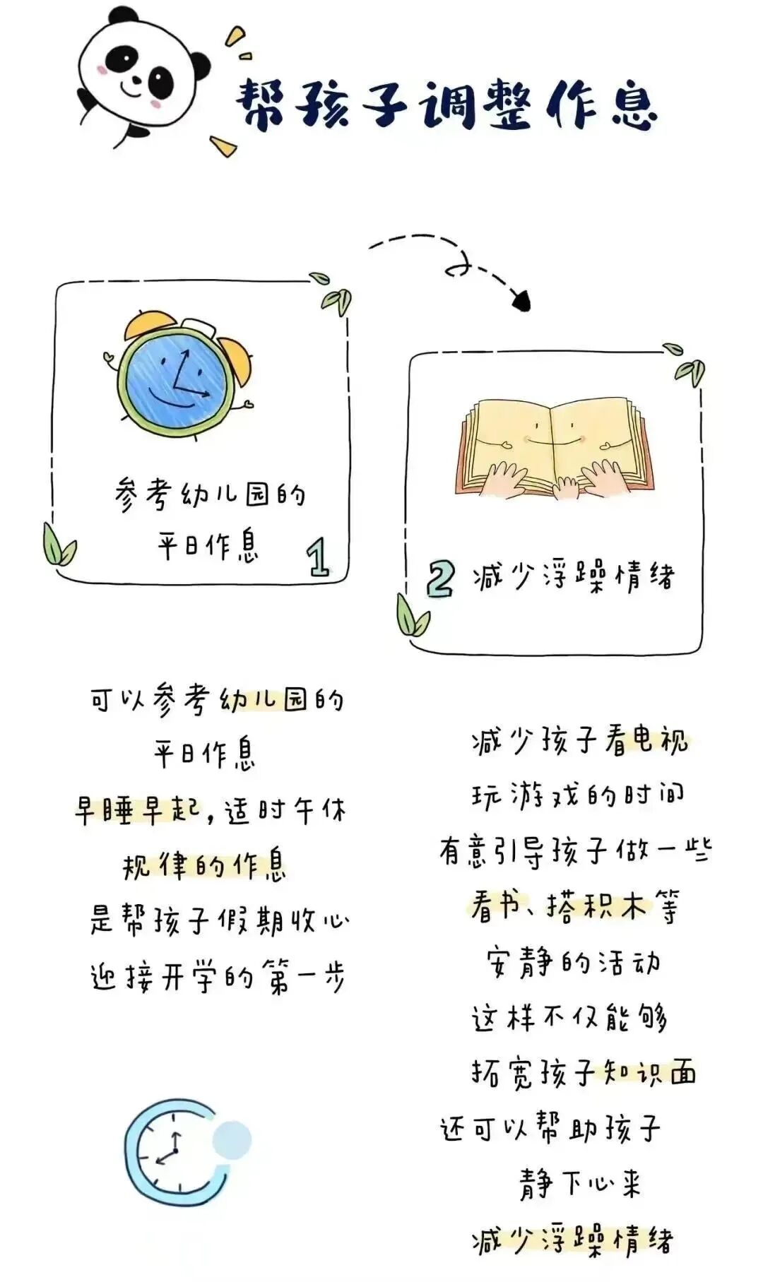 健康管理篇 1.调整作息时间 生活作息规律对幼儿来说至关重要,作息规律的幼儿会表现出更积极乐观的心态和更良好的状态。开学在即,请家长们尽量按照幼儿园作息时间,逐渐调整宝贝的生物钟,为开学做好充分的准备。 2.调整饮食习惯 注意培养宝贝良好的饮食习惯,注意饭菜营养均衡,多吃蔬菜和水果,养成按时进餐和独立进食的好习惯。 3.养成良好卫生习惯 良好的卫生习惯有助于幼儿身体健康和生长发育。请提醒宝贝像在幼儿园一样保持良好的卫生习惯,如饭前洗手、饭后漱口等,并在开学前帮宝贝剪指甲,着装整洁入园。 4.提升自理能力 为了让宝贝开学前尽快适应集体生活,家长们可以引导宝贝独立完成吃饭刷牙、穿脱衣物等力所能及的事,培养良好自理能力和信心。 入园准备篇 1.物质准备 请家长注意留意班级老师信息,给宝贝准备好开学必备用品,如:小书包、换洗衣物等(根据班级群通知)。 2.心理准备 小班新生宝贝: (1) 认识幼儿园 对于宝贝而言,家是再熟悉不过的生活、游戏和活动空间。因此,可以从“家”与“园”的区别入手,帮助宝贝建立对于幼儿园的初步认识,在脑海中勾勒出幼儿园的大致模样,从而减轻他们对于新环境的陌生感。此外,还可以带宝贝熟悉上学路线,参观幼儿园外部环境,一起浏览幼儿园公众号,欣赏小朋友们快乐的游戏、趣味的活动等,激发喜爱幼儿园的情感。 (2) 通过绘本阅读缓解幼儿内心焦虑 幼儿园的生活究竟是什么样子的呢?可以借助与幼儿园有关的绘本故事,和宝贝一起阅读,分享温情的幼儿园生活,学习故事中主人翁的积极心态,让宝贝渐渐信赖老师,萌发上幼儿园的喜爱之情,从而缓解入园焦虑。 中大班宝贝: 缓解紧张情绪和升班焦虑 开学前,家长可跟宝贝多谈谈幼儿园生活,讲讲在幼儿园里发生的趣事,以此唤起宝贝对新学期的向往,唤起积极情绪。 给予宝贝足够的安全感,让宝贝意识到家人会一直陪伴着自己,让他们有勇气面对接下来的幼儿园生活。 幼儿园的美好风景